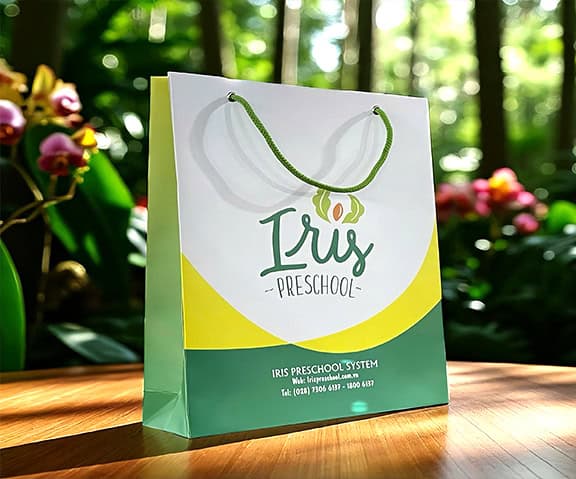 A custom paper gift bag blending eco-friendly materials, gentle colors, and refined finishing to extend Iris Preschool’s premium brand identity.